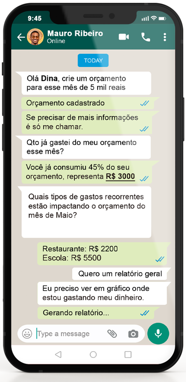 Você administra tudo de forma muito0 natural, como se vc tivesse falando com um amigo pelo Whatsapp. Envie um pequeno áudio ou texto. Enviou mensagem, ela entende e registra.