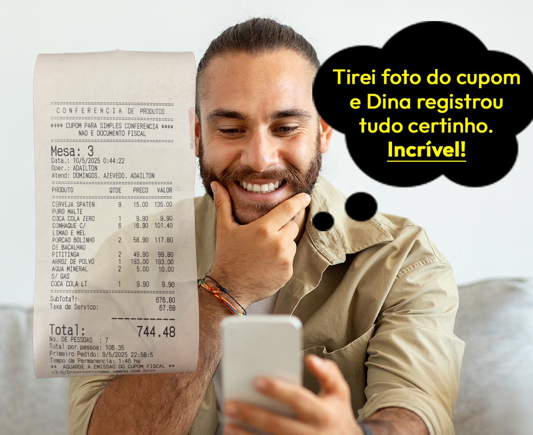 Dina, analisa a imagem e registra os dados principais — valor, estabelecimento, local e data.